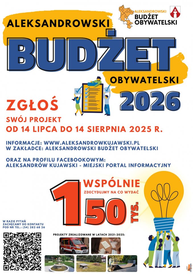 Z przyjemnością informujemy, że rozpoczęła się kolejna edycja Aleksandrowskiego Budżetu Obywatelskiego 2026! Mieszkańcy naszego miasta mają szansę zgłaszać swoje pomysły, które będą mogły zostać zrealizowane dzięki środkom w wysokości 150 000,00 zł. Nabór wniosków trwa do 14 sierpnia 2025 roku.