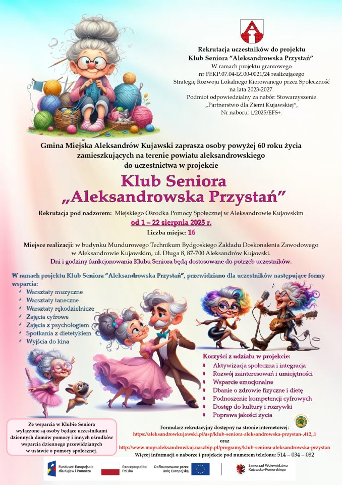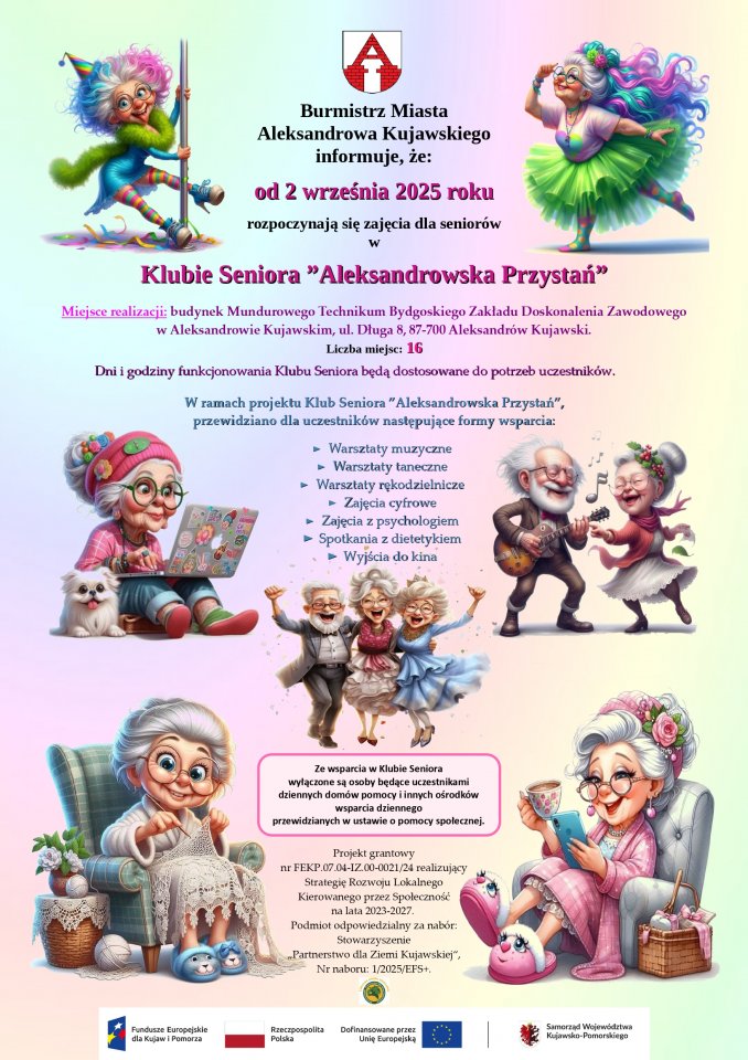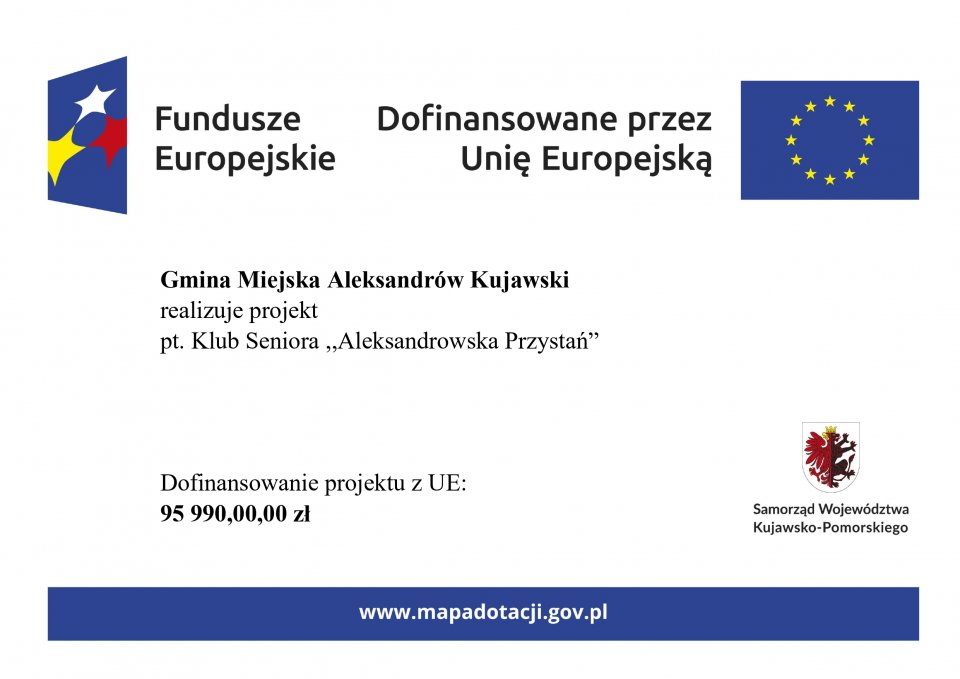 Projekt pt. Klub Seniora "Aleksandrowska Przystań" realizowany przez Miejski Ośrodek Pomocy Społecznej w Aleksandrowie Kujawskim, w ramach projektu grantowego nr FEKP.07.04 IZ.00 0021/24 realizującego Strategię Rozwoju Lokalnego Kierowanego przez Społeczność na lata 2023-2027. Projekt współfinansowany ze środków Unii Europejskiej w ramach Europejskiego Funduszu Społecznego Plus, Program: Fundusze Europejskie dla Kujaw i Pomorza na lata 2021-2027, Priorytet 7. Fundusze europejskie na rozwój lokalny, Działanie: FEKP.07.04 Wspieranie integracji społecznej. Podmiot odpowiedzialny za nabór: Stowarzyszenie „Partnerstwo dla Ziemi Kujawskiej”, Nr naboru: 1/2025/EFS+.