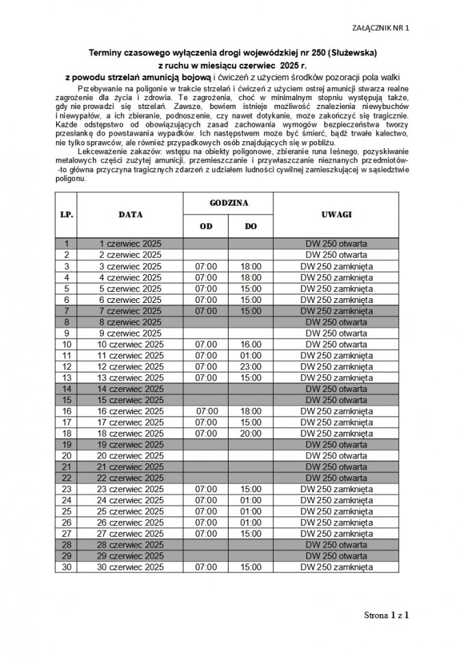 Terminy zamknięcia drogi wojewódzkiej nr 250 - Poligon